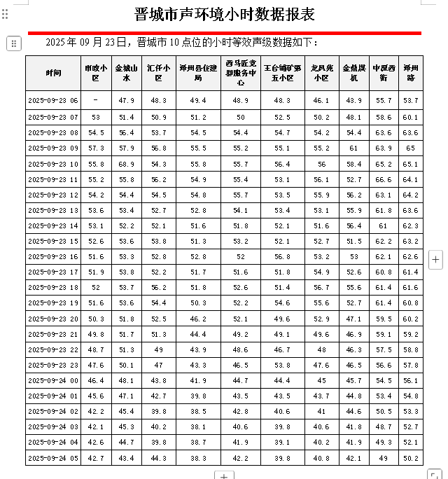 晋城市声环境小时数据报表(2025年09月24日)
