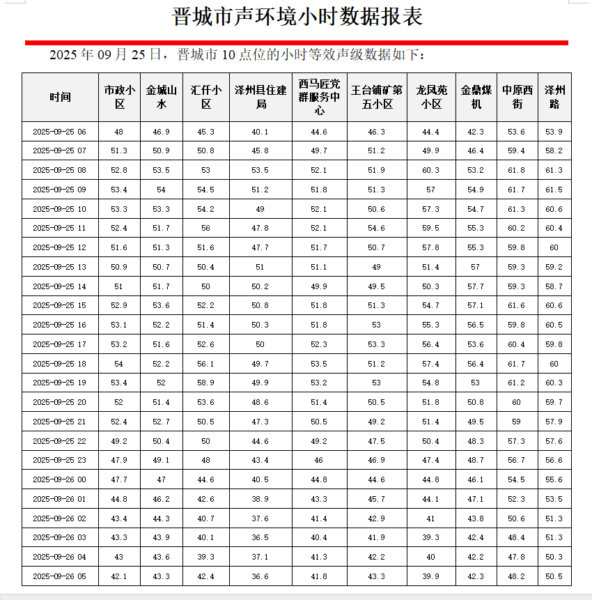 晋城市声环境小时数据报表(2025年09月26日)