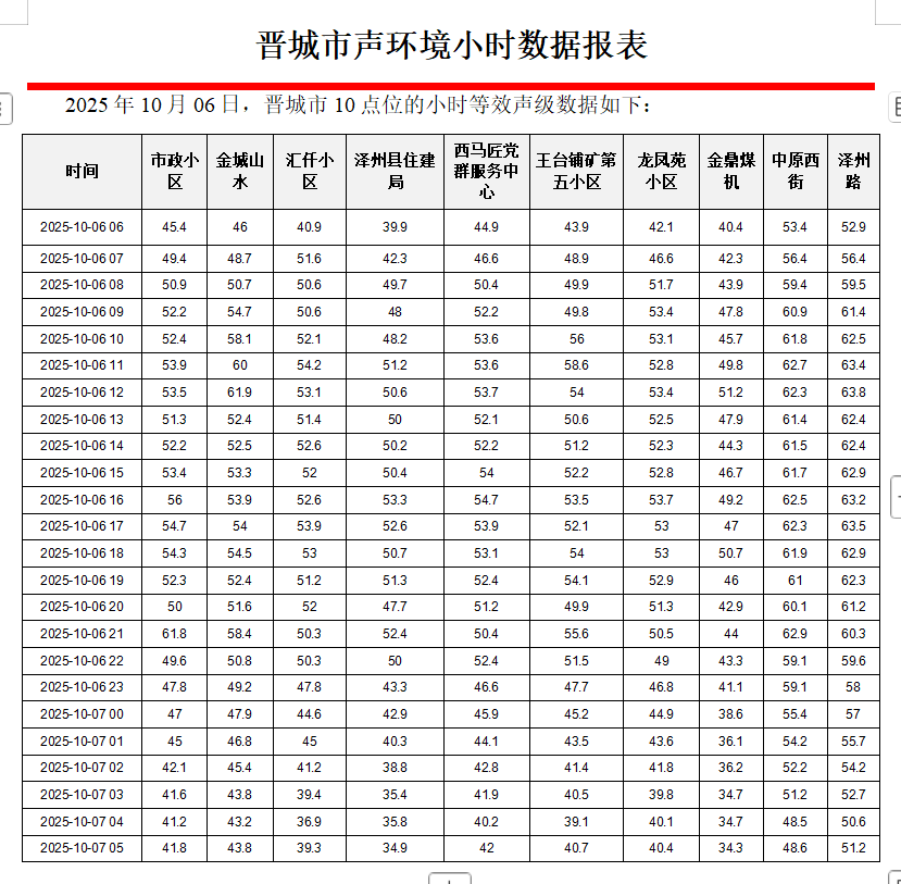 晋城市声环境小时数据报表(2025年10月07日)