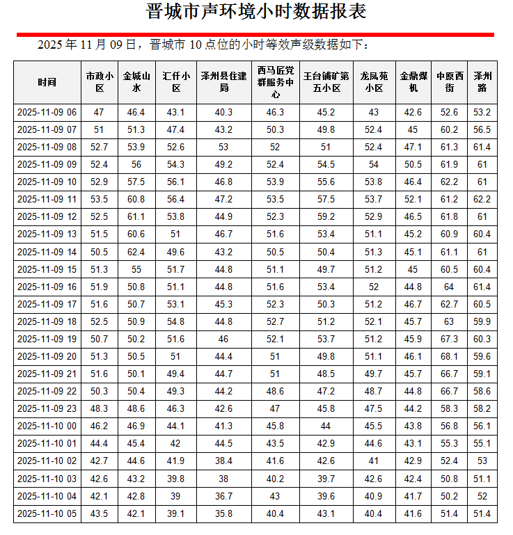 晋城市声环境小时数据报表(2025年11月10日)
