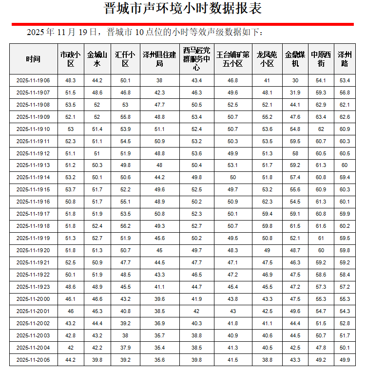 晋城市声环境小时数据报表(2025年11月20日)