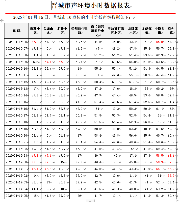 晋城市声环境小时数据报表(2026年01月17日)