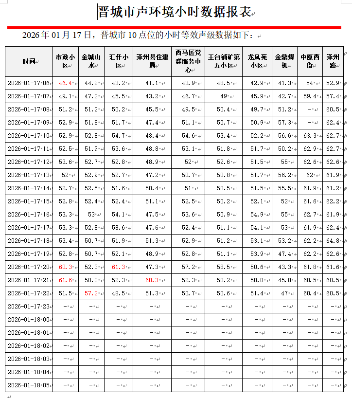 晋城市声环境小时数据报表(2026年01月18日)