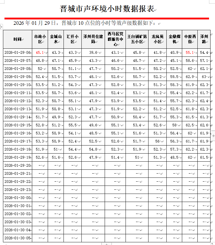 晋城市声环境小时数据报表(2026年01月30日)
