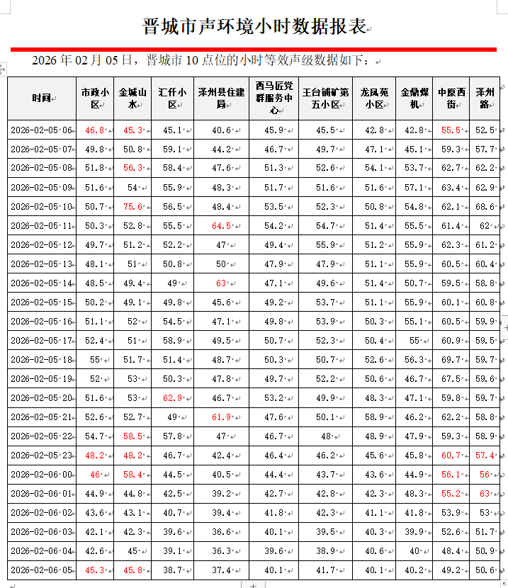 晋城市声环境小时数据报表(2026年02月06日)