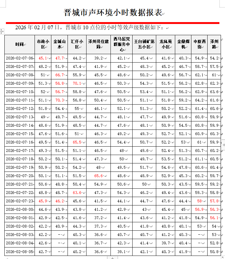 晋城市声环境小时数据报表(2026年02月08日)
