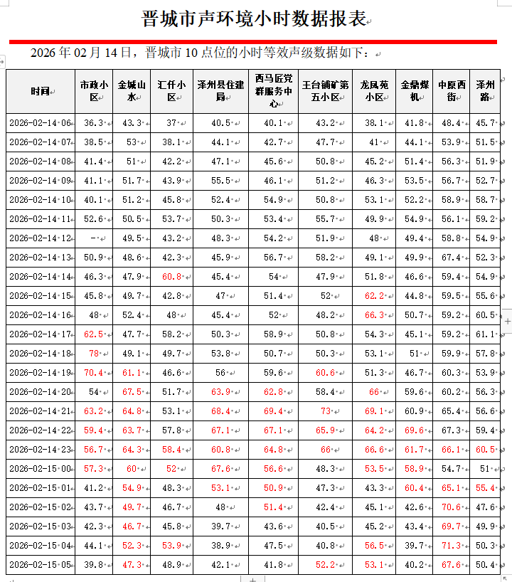晋城市声环境小时数据报表(2026年02月15日)