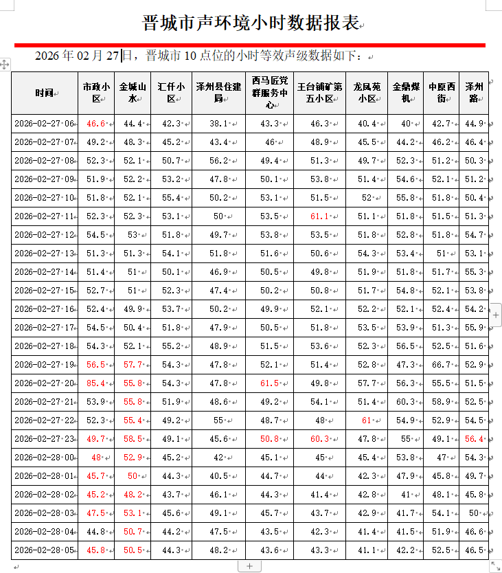 晋城市声环境小时数据报表(2026年02月28日)
