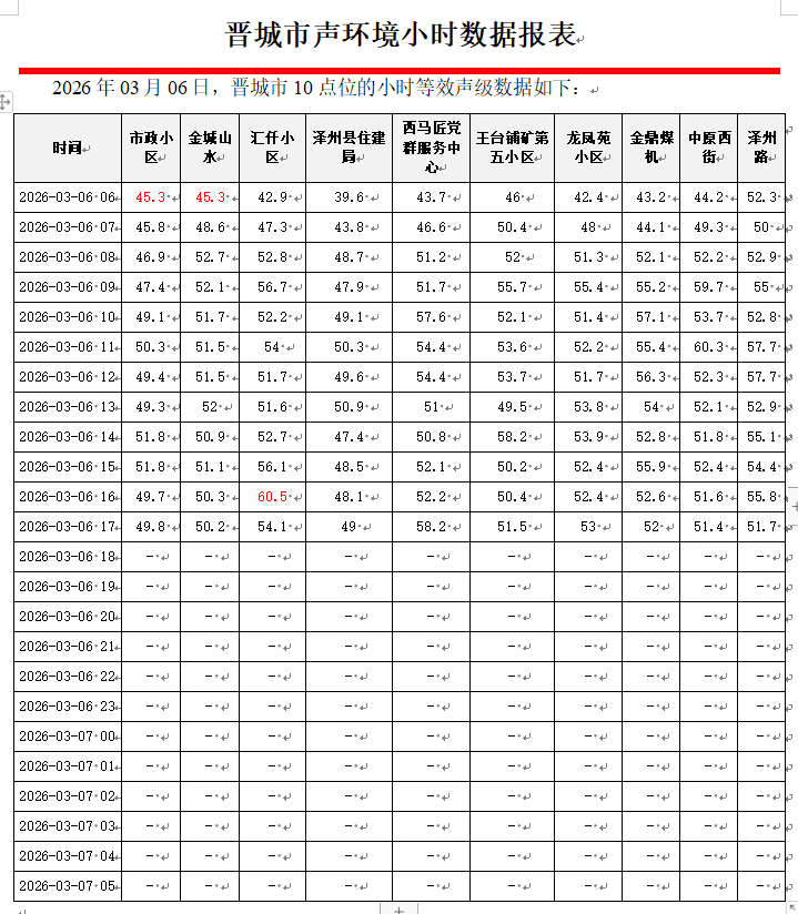 晋城市声环境小时数据报表(2026年03月07日)
