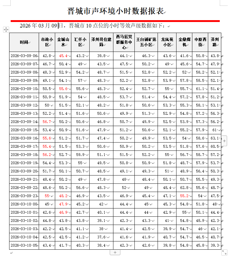 晋城市声环境小时数据报表(2026年03月10日)