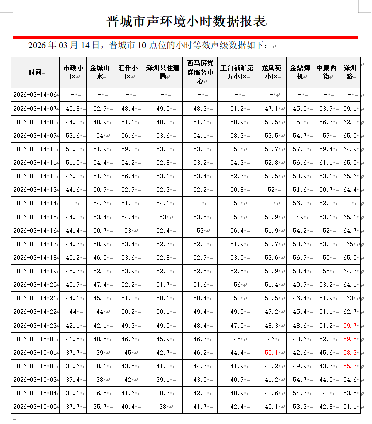 晋城市声环境小时数据报表(2026年03月15日)